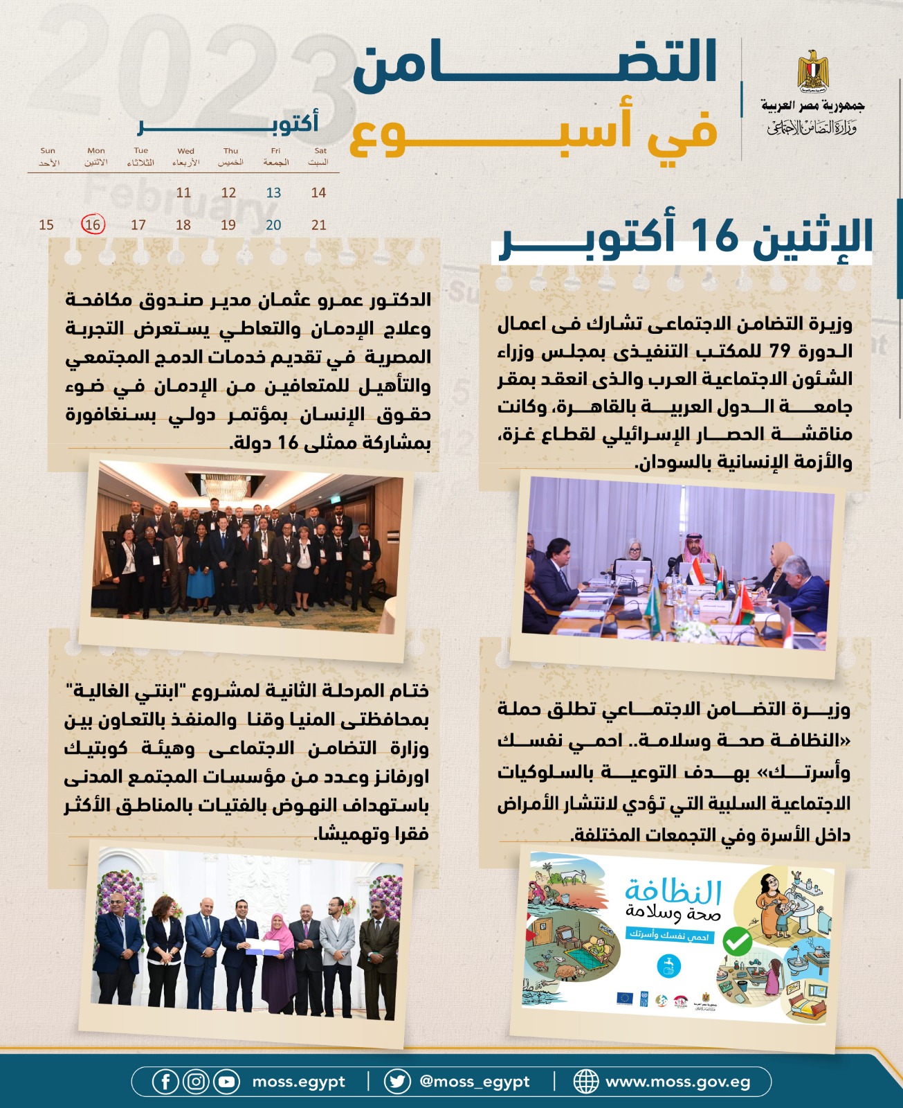 - وزيرة التضامن الاجتماعي تطلق حملة «النظافة صحة وسلامة..احمي نفسك وأسرتك» بهدف التوعية بالسلوكيات الاجتماعية السلبية التي تؤدي لانتشار الأمراض داخل الأسرة وفي التجمعات المختلفة.