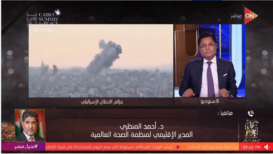 قال الدكتور أحمد المنظري، المدير الإقليمي لمنظمة الصحة العالمية لشرق المتوسط، إنه قطاع غزة يمر بمرحلة صحية خطيرة في ظل تردي الأوضاع الإنسانية والقصف المتكرر والذي دمر البنى التحتية الصحية بشكل كبير.