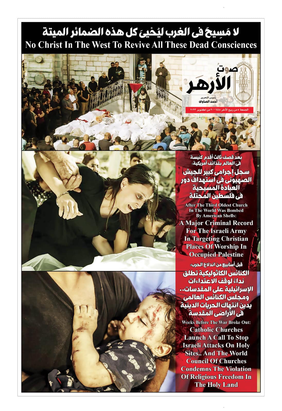 وخصص الأزهر الشريف عدده الجديد من جريدة صوت الأزهر لتوجيه الرسالة، كاشفا أبرز هذه الجرائم في غلاف الجريدة التي حملت عنوانا رئيسيا : “لا مَسِيحَ في الغرب ليُحْيىَ كل هذه الضمائر الميتة”