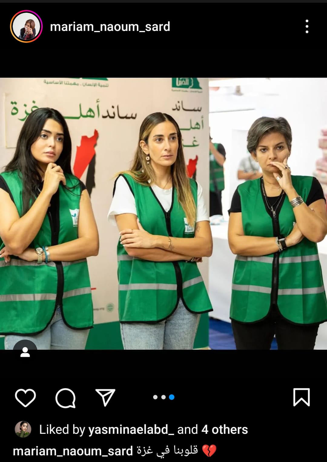 ونشرت مريم نعوم صورة تجمعها مع الفنانة أمينة خليل و الفنانة أسماء جلال على صفحتها الرسمية عبر موقع التواصل الاجتماعي “ فيسبوك ” و علقت قائلة “ قلوبنا في غزة ” .