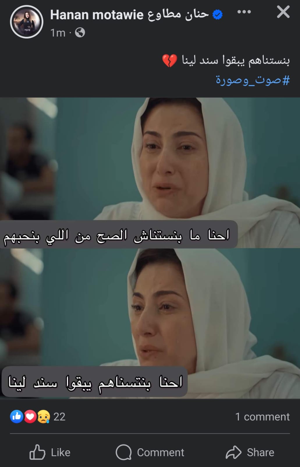 نشرت الفنانة حنان مطاوع صورة من إحدى مشاهدها بالمسلسل على صفحتها الرسمية عبر موقع التواصل الاجتماعي “ فيسبوك ” و علقت قائلة “ بنستناهم يبقوا سند لينا ” .