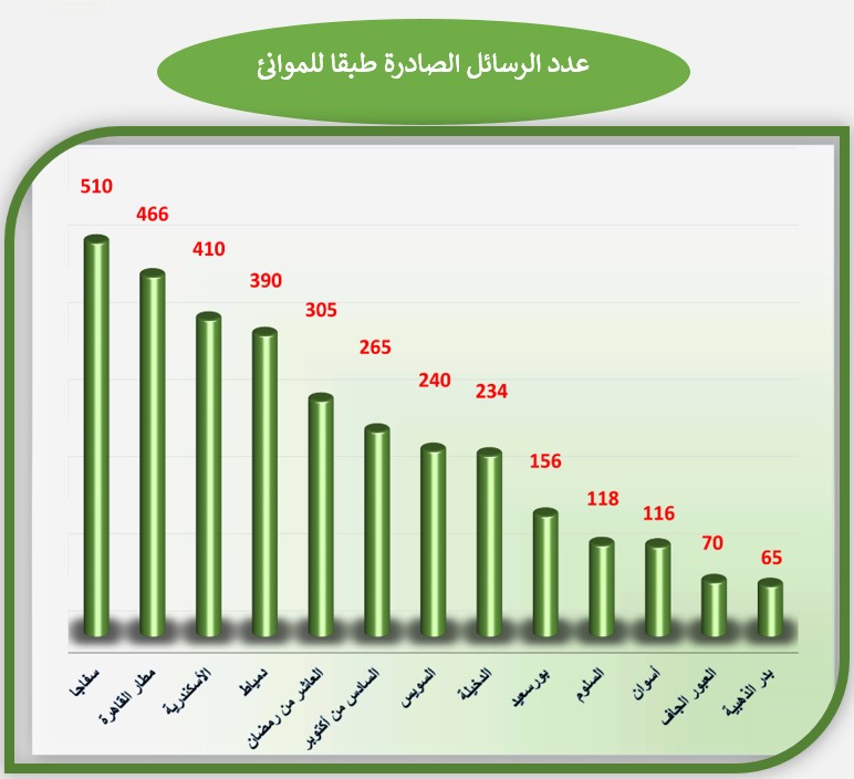 ولا يزال ميناء سفاجا يحتل المركز الأول في عدد الرسائل الغذائية المصدرة منه بإجمالي 510 رسالة، يليه ميناء مطار القاهرة بـ 466 رسالة، ثم ميناء الإسكندرية بإجمالي 410 رسالة.