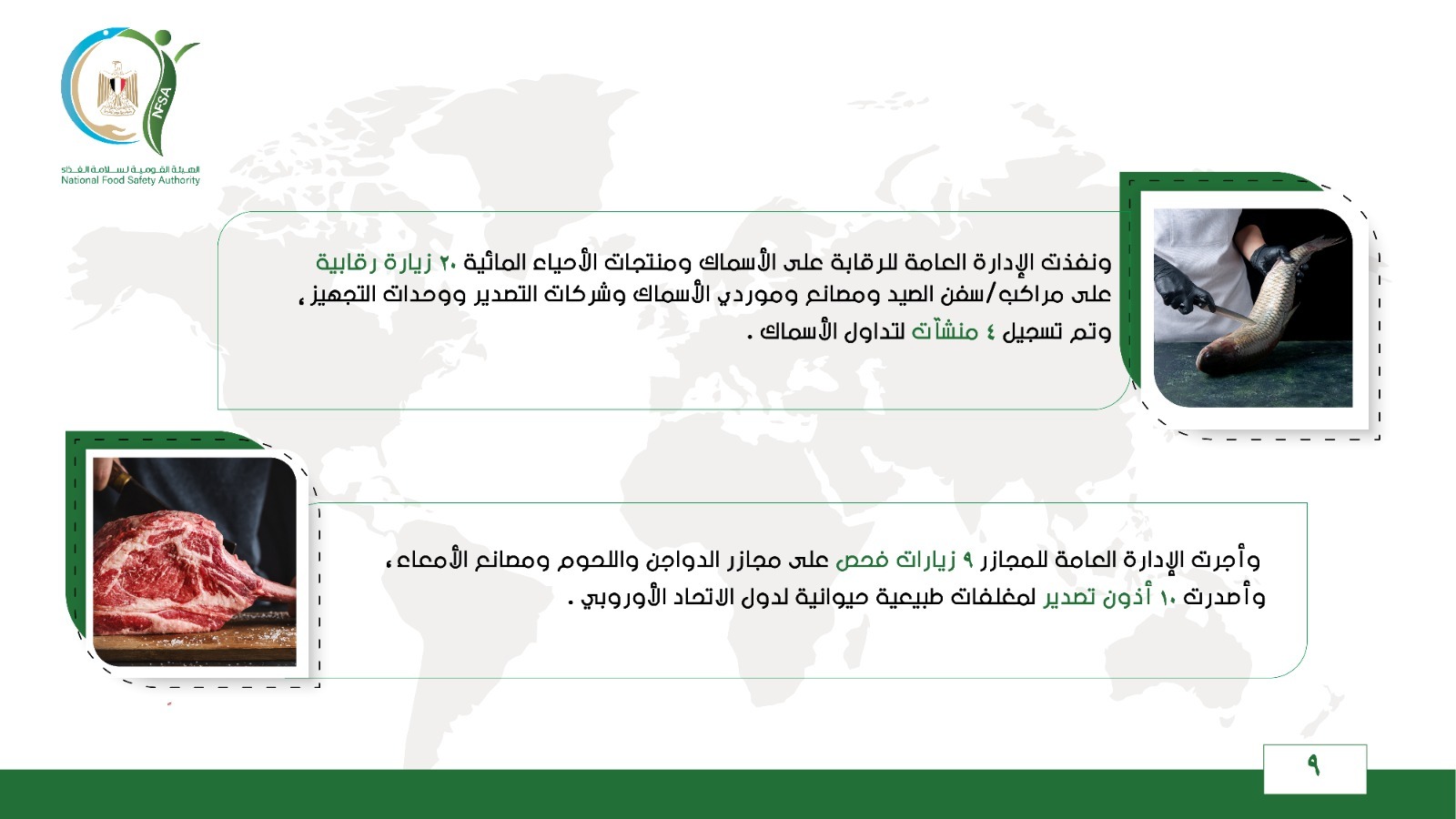 وأجرت الإدارة العامة للمجازر 9 زيارات فحص على مجازر الدواجن واللحوم ومصانع الأمعاء، وأصدرت 10 أذون تصدير لمغلفات طبيعية حيوانية لدول الاتحاد الأوروبي.