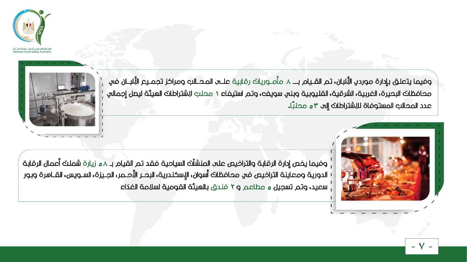 وفيما يتعلق بإدارة موردي الألبان، تم القيام بــــ 8 مأموريات رقابية على المحالب ومراكز تجميع الألبان في محافظات البحيرة، الغربية، الشرقية، القليوبية وبني سويف، وتم استيفاء 1 محلب لاشتراطات الهيئة ليصل إجمالي عدد المحالب المستوفاة للاشتراطات إلى 53 محلبًا.