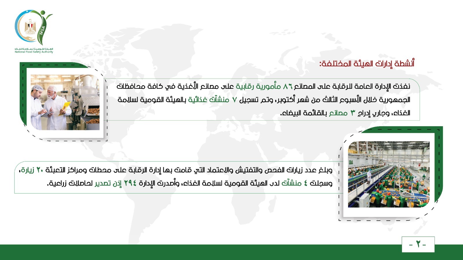 نفذت الإدارة العامة للرقابة على المصانع 86 مأمورية رقابية على مصانع الأغذية في كافة محافظات الجمهورية خلال الأسبوع الثالث من شهر أكتوبر، وتم تسجيل 7 منشآت غذائية بالهيئة القومية لسلامة الغذاء، وجاري إدراج 3 مصانع بالقائمة البيضاء.