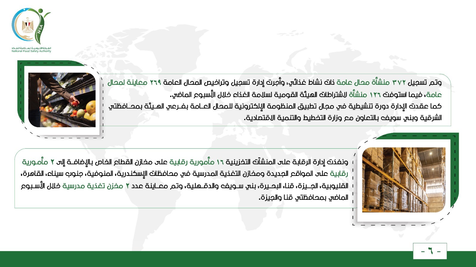 ونفذت إدارة الرقابة على المنشآت التخزينية 16 مأمورية رقابية على مخازن القطاع الخاص بالإضافة إلى 2 مأمورية رقابية على المواقع الجديدة ومخازن التغذية المدرسية في محافظات الإسكندرية، المنوفية، جنوب سيناء، القاهرة، القليوبية، الجيزة، قنا، البحيرة، بني سويف والدقهلية، وتم معاينة عدد 2 مخزن تغذية مدرسية خلال الأسبوع الماضي بمحافظتي قنا والجيزة.