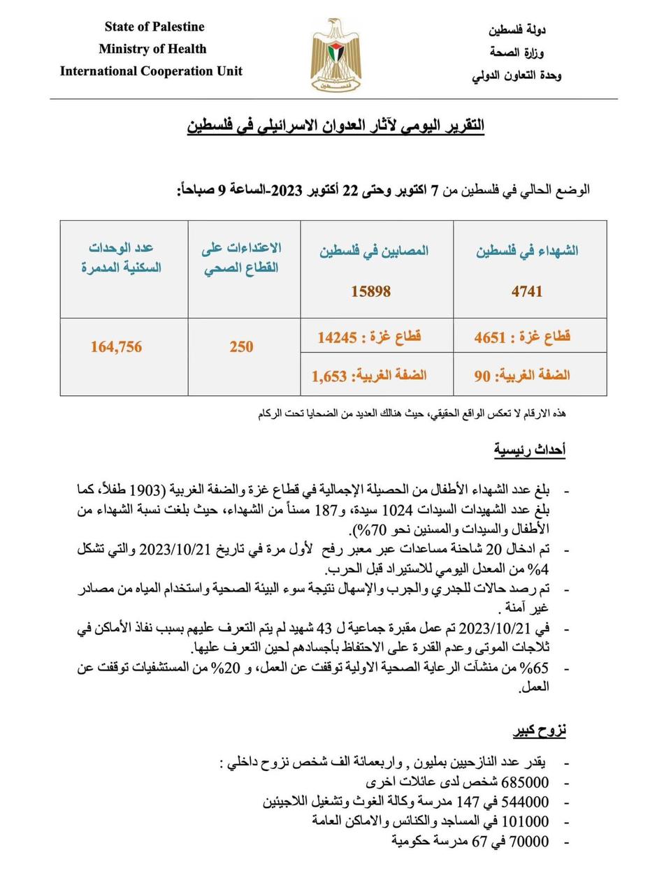 وكشفت الوزارة عن استشهاد 4741 فلسطينيا حتى اليوم بينهم 90 في الضفة الغربية، كما أصيب 15898 بينهم 1653 في الضفة، إلى جانب تعرض أكثر من 250 مرفقا لصحيا للاعتداء، وتدمير 164756 وحدة سكنية.