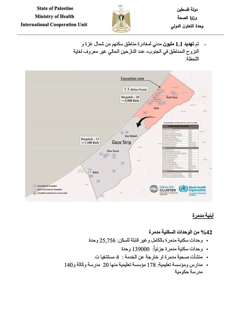 وتواصل سلطات الاحتلال الضغط على المستشفيات شمال غزة للاخلاء والتوجه جنوباً، علماً بأن المشافي تضم الآلاف من الجرحى والمرضى وعشرات الآلاف من أهالي الجرحى والمرضى.