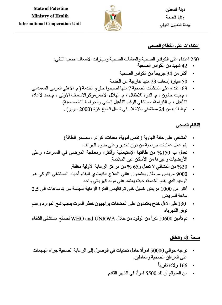 وأعلنت وزارة الصحة الفلسطينية حصيلة الوضع الحالي في فلسطين منذ بدء الاعتداء الإسرائيلي على قطاع غزة حتى صباح اليوم.