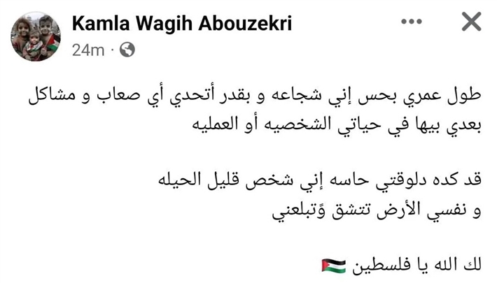 وكتبت كاملة أبو ذكري عبر صفحتها على فيس بوك: "طول عمري بحس إني شجاعة وبقدر أتحدى أي صعاب ومشاكل بعدي بيها في حياتي الشخصية والعملية، قد كده دلوقتي حاسة إني شخص قليل الحيلة ونفسي الأرض تنشق وتبلعني لك الله يا فلسطين