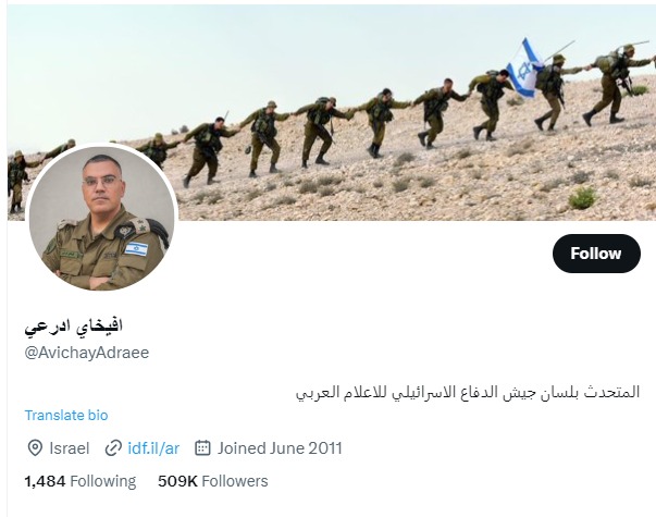 منصة "إكس" تويتر سابقا تلغي توثيق حساب أفيخاي أدرعي المتحدث باسم الجش الإسرائيلي