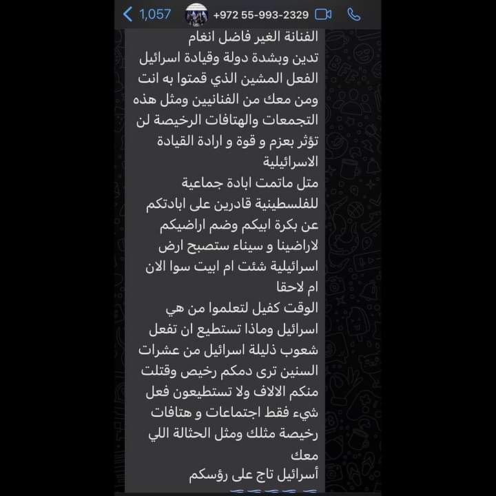 تلقت الفنانة أنغام رسالة تهديد على هاتفها خلال الساعات القليلة الماضية بعد أن لقنت درسا تاريخيا للمتحدث العربي لجيش الاحتلال الإسرائيلي .