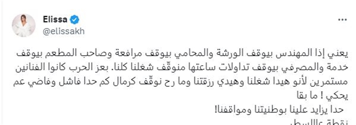 وكتبت إليسا عبر حسابها على موقع إكس،: “يعني إذا المهندس بيوقف الورشة والمحامي بيوقف مرافعة وصاحب المطعم بيوقف خدمة والمصرفي بيوقف تداولات ساعتها منوقف شغلنا كلنا. بعز الحرب كانوا الفنانين مستمرين لأنو هيدا شغلنا وهيدي رزقتنا وما رح نوقف كرمال كم حدا فاشل وفاضي عم يحكي! ما بقا حدا يزايد علينا بوطنيتنا ومواقفنا! نقطة عالسطر”