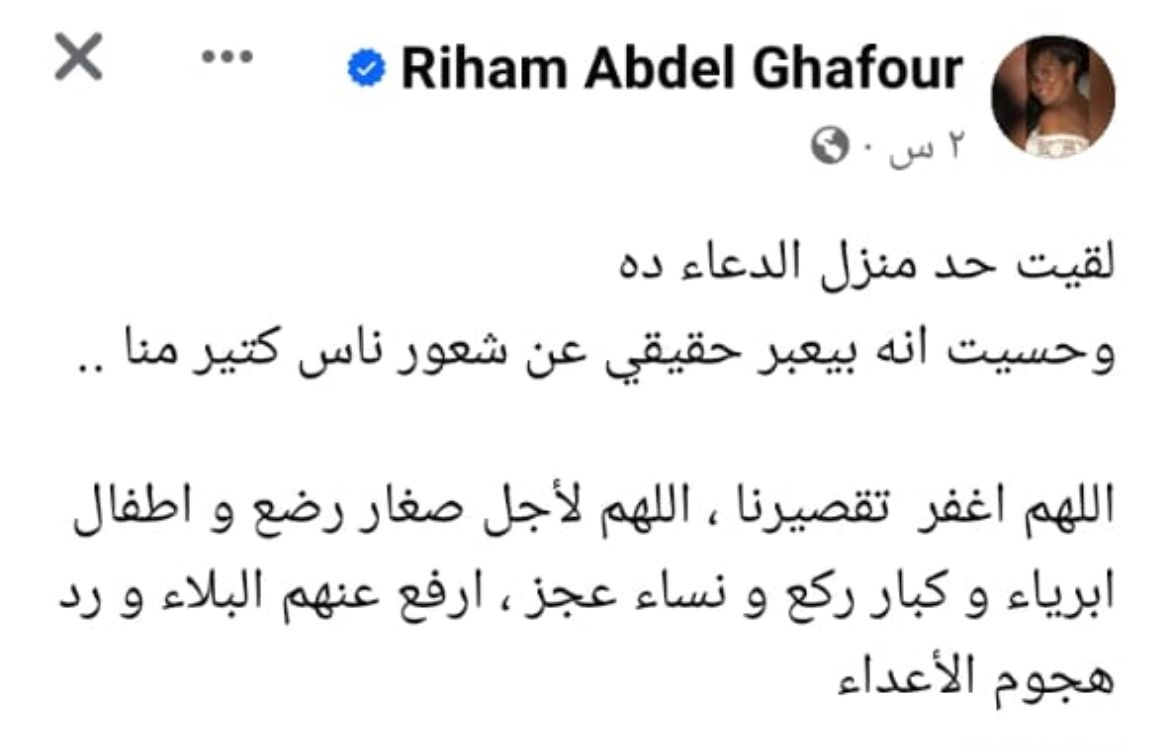 ودعت الفنانة ريهام عبد الغفور، جمهورها للتضامن مع أهالي غزة، كما نشرت دعاء للشهداء قائلة:" لقيت حد منزل الدعاء ده وحسيت انه بيعبر حقيقي عن شعور ناس كتير منا.. اللهم اغفر تقصيرنا ، اللهم لأجل صغار رضع و اطفال ابرياء و كبار ركع و نساء عجز ، ارفع عنهم البلاء و رد هجوم الأعداء".