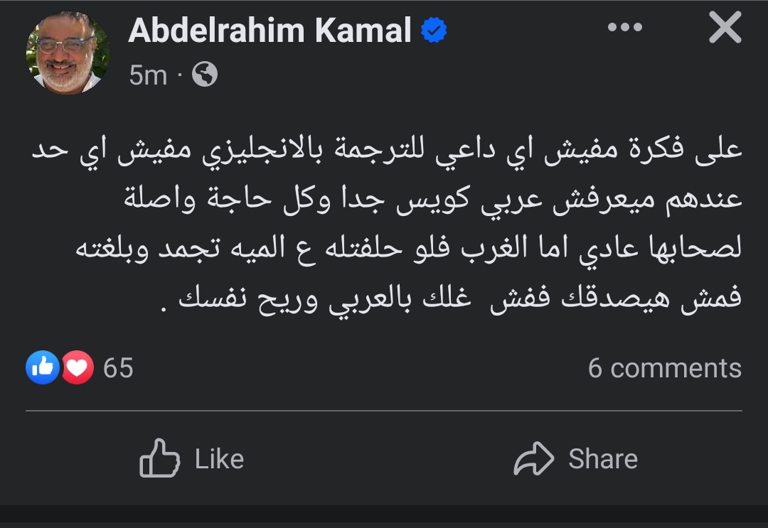 وكتب عبد الرحيم كمال منشورا على صفحته الرسمية عبر موقع التواصل الاجتماعي “ فيسبوك ” و علق قائلا “ على فكرة مفيش أي داعي للترجمة بالإنجليزي، مفيش أي حد عندهم ميعرفش عربي كويس جدا، و كل حاجة واصلة لصحابها عادي ” .