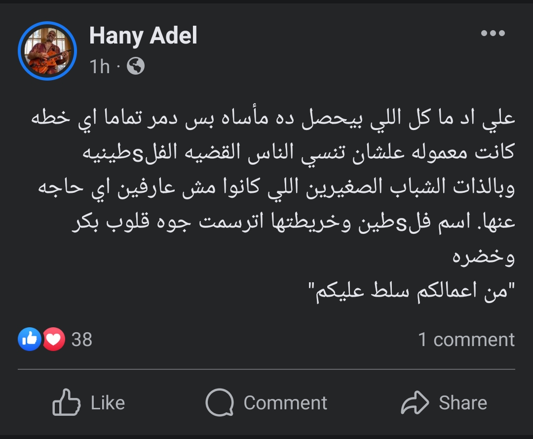 كتب هاني عادل منشور على صفحته الرسمية عبر موقع التواصل الاجتماعي “ فيسبوك ” و علق قائلا “ على أد ما كل اللي بيحصل ده مأساة، بس دمر تماما أي خطة كانت معمولة علشان تنسي الناس القضية الفلسطينية، و بالذات الشباب الصغيرين اللي كانوا مش عارفين أي حاجة عنها ”
