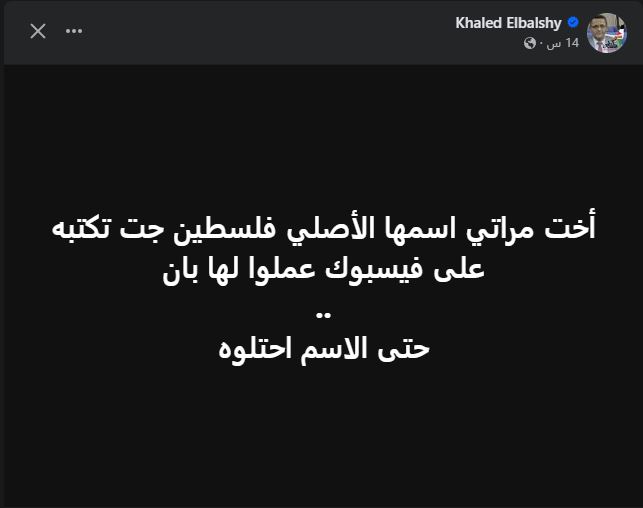 وكتب البلشي، علي صحفتة بالفيس بوك" أخت زوجتي اسمها الحقيقي فلسطين.. دخلت تعمل أكونت بالاسم الفيس بوك عملها بان وحذفها.. حتي الأسم احتلوه".