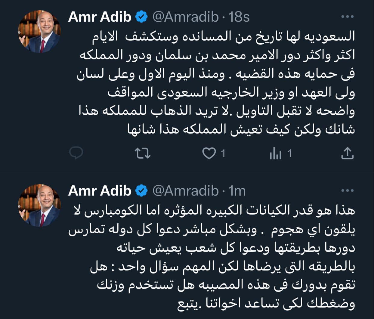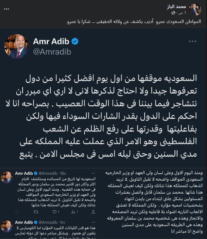 وعلق الباز على تغريداته : “المواطن السعودي عمرو أديب يكشف ولائه الحقيقي .. شكرا يا عمرو”