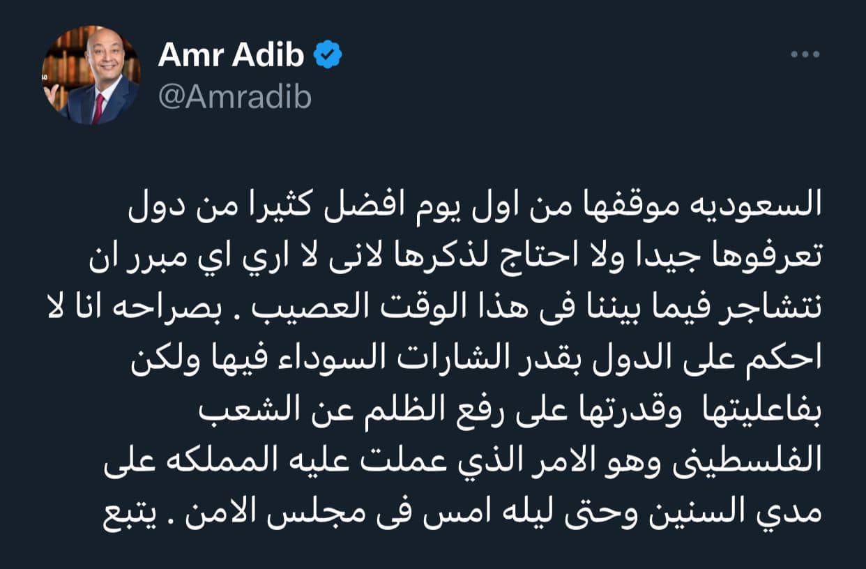 هاجم الدكتور محمد الباز رئيس مجلسي الإدارة والتحرير لمؤسسة الدستور، الإعلامي عمرو أديب ، بسبب تغيرادته علي موقع التواصل الإجتماعي “أكس”، تويتر سابقا، حيث تطرق عمرو أديب في تغريداتة عن الدور الكبير والفاعل الذي تلعبة المملكة العربية السعودية في أزمة الفلسطنين، والمجاز الصهيونية بحق الفلسطنين بغزة.