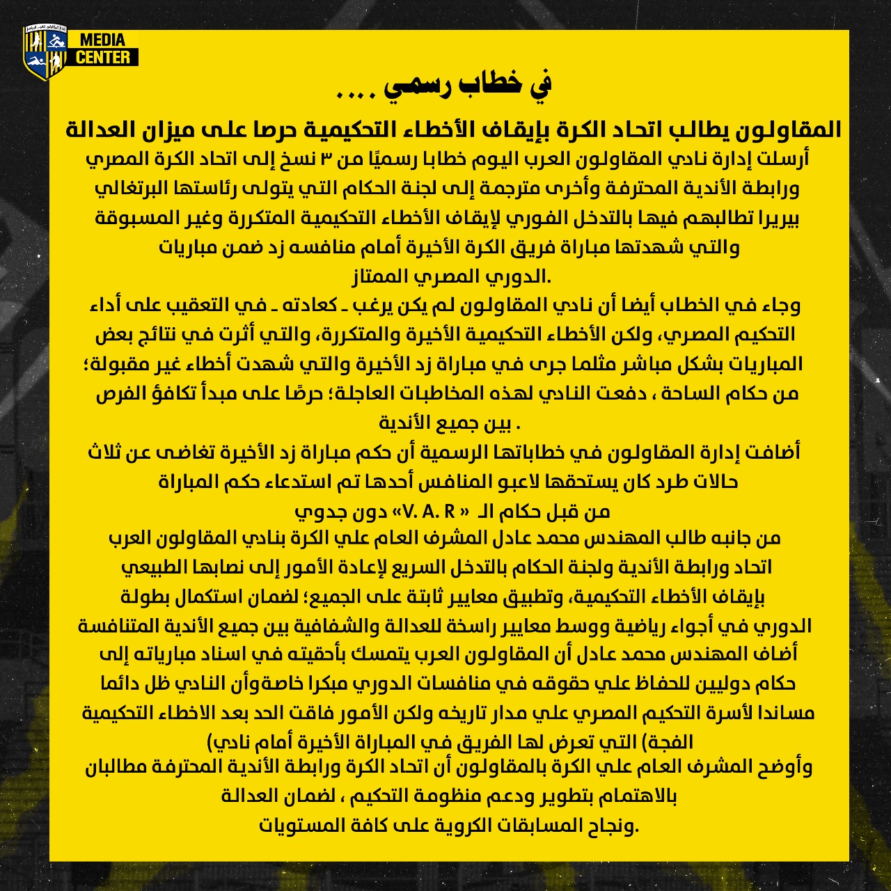 أرسلت إدارة نادي المقاولون العرب اليوم، خطابا رسميًا من 3 نسخ إلى اتحاد الكرة المصري ورابطة الأندية المحترفة وأخرى مترجمة إلى لجنة الحكام التي يتولى رئاستها البرتغالي بيريرا تطالبهم فيها بالتدخل الفوري لإيقاف الأخطاء التحكيمية المتكررة وغير المسبوقة والتي شهدتها مباراة فريق الكرة الأخيرة أمام منافسه زد ضمن مباريات الدوري المصري الممتاز.