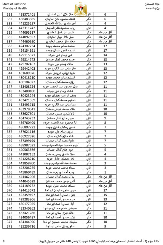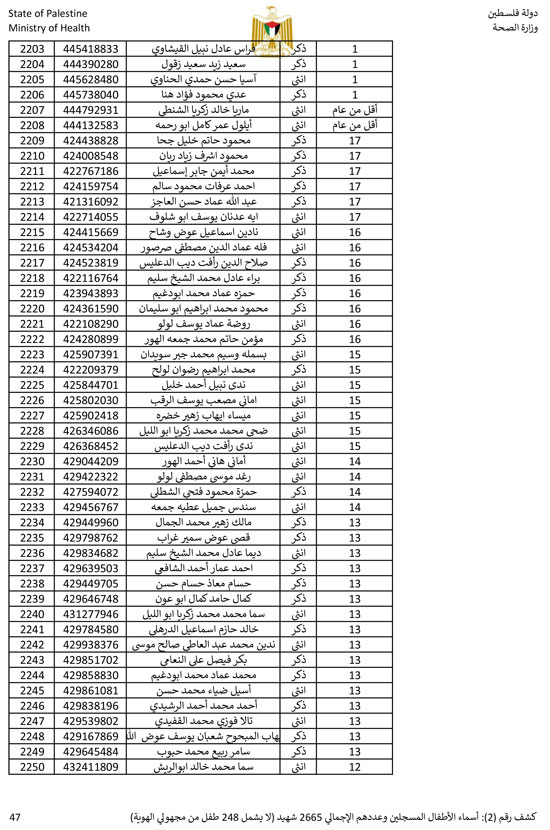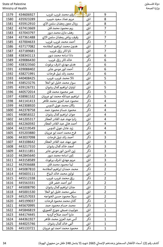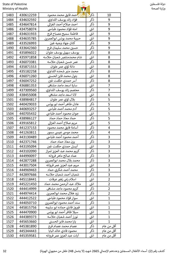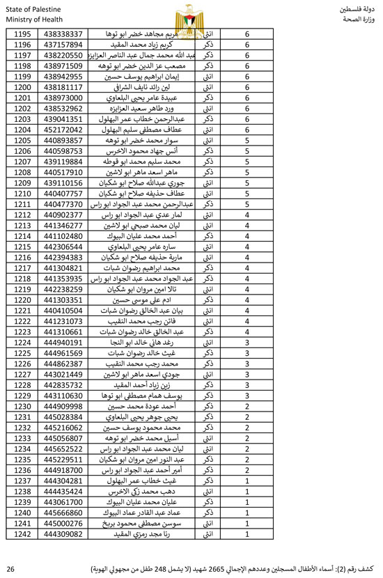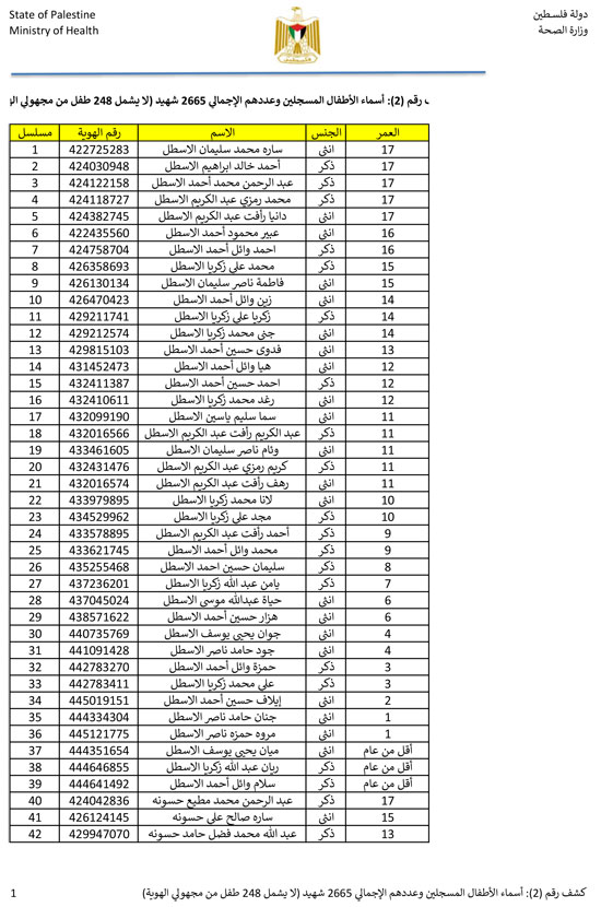 كشفت وزارة الصحة الفلسطينية فى تقرير مفصل لها عن القائمة الكاملة لأسماء وأعداد الشهداء الفلسطنيين بسبب العدوان الإسرائيلي على غزة ، بعد التشكيك الأمريكي في الإحصائيات التي تصدرها الصحة الفلسطينية بالقطاع بشكل يومى.