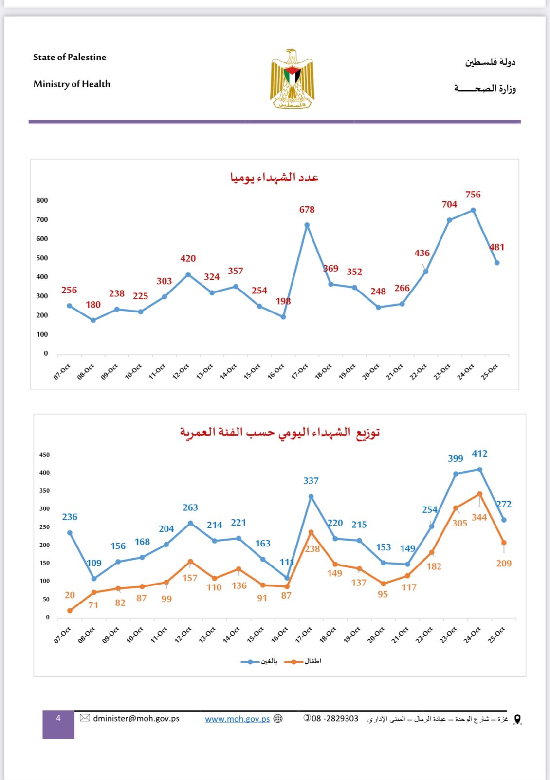 لفتت الصحة الفلسطينية إلى أن الاحتلال الإسرائيلي ارتكب 43 مجزرة في الساعات الماضية راح ضحيتها 481 شهيدا غالبيتهم من النازحين إلى جنوب قطاع غزة التي يزعم الاحتلال الإسرائيلي أنها آمنة، موضحا أن الانتهاكات الإسرائيلية ضد المنظومة الصحية أدت إلى استشهاد 101 من الكوادر الصحية وتدمير 25 سيارة إسعاف وخروجها عن الخدمة.