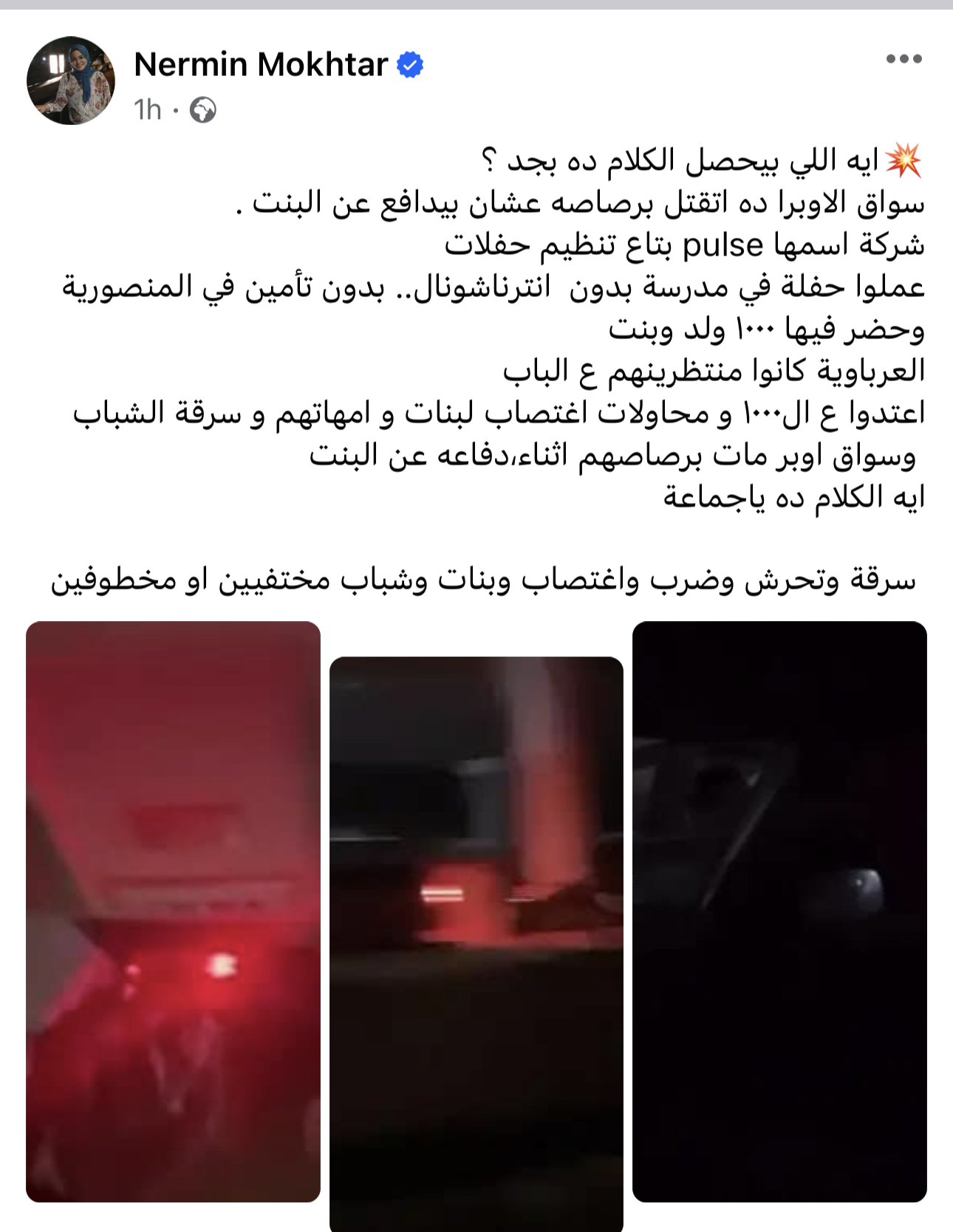 وقالت إحدى متداولى الواقعة،" ايه اللي بيحصل الكلام ده بجد ؟ سواق الاوبرا ده اتقتل برصاصه عشان بيدافع عن البنت .. شركة اسمها pulse بتاع تنظيم حفلات عملوا حفلة في مدرسة بدون انترناشونال.. بدون تأمين في المنصورية وحضر فيها 1000 ولد وبنت .. العرباويةكانوا منتظرينهم ع الباب اعتدوا ع ال1000 و محاولات اغتصاب لبنات و امهاتهم و سرقة الشباب وسواق اوبر مات برصاصهماثناء،دفاعه عن البنت ".