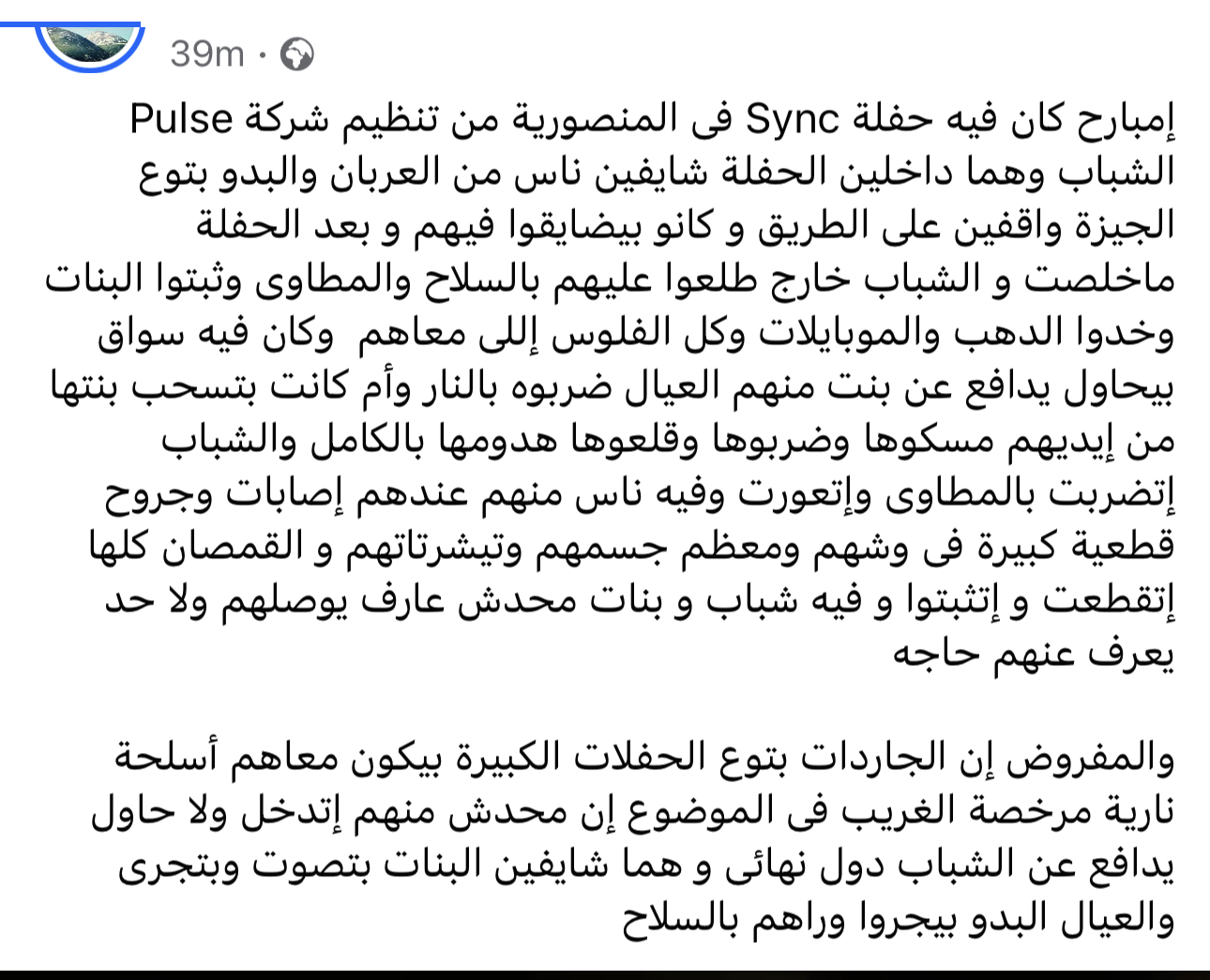 ده مش فلسطين ولا طابا ولا نوييع ده في القاهره مع اولادنا و بناتنا، بنتي و بنات و اولاد اصحابي ، الولاد الي بتصوت دي، احنا نعرفهم ونعرف اهاليهم. انا حاولت مبقاش سلبيه لعل و عسي حد يشوف او يسمع و ياخد موقف. دي حفله من الحفلات منظماها شركه معروفه،لاطفال و شباب ماحصلوش 16 سنه ، طلع عليهم العرب امبارح سرقوهم و اتحرشوا بالبنات و ضربوا الصبيان ولادنا و بناتنا.