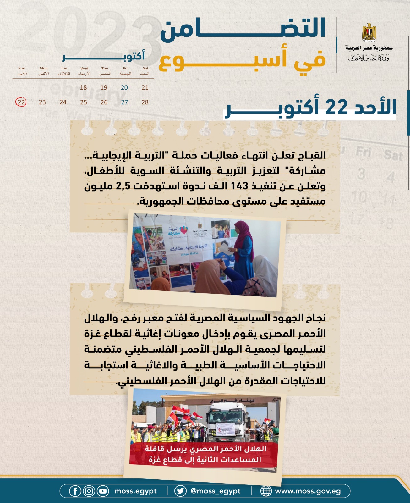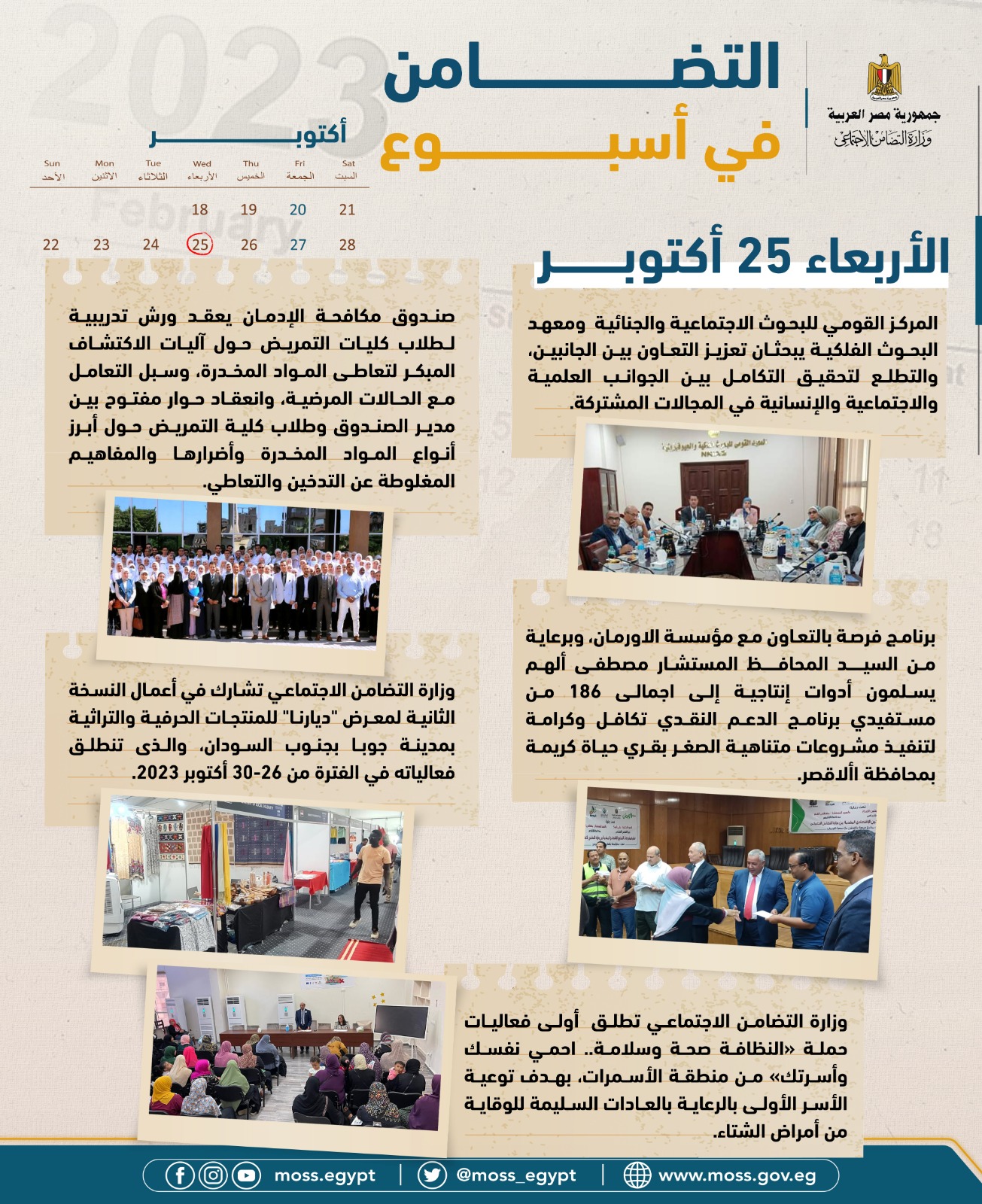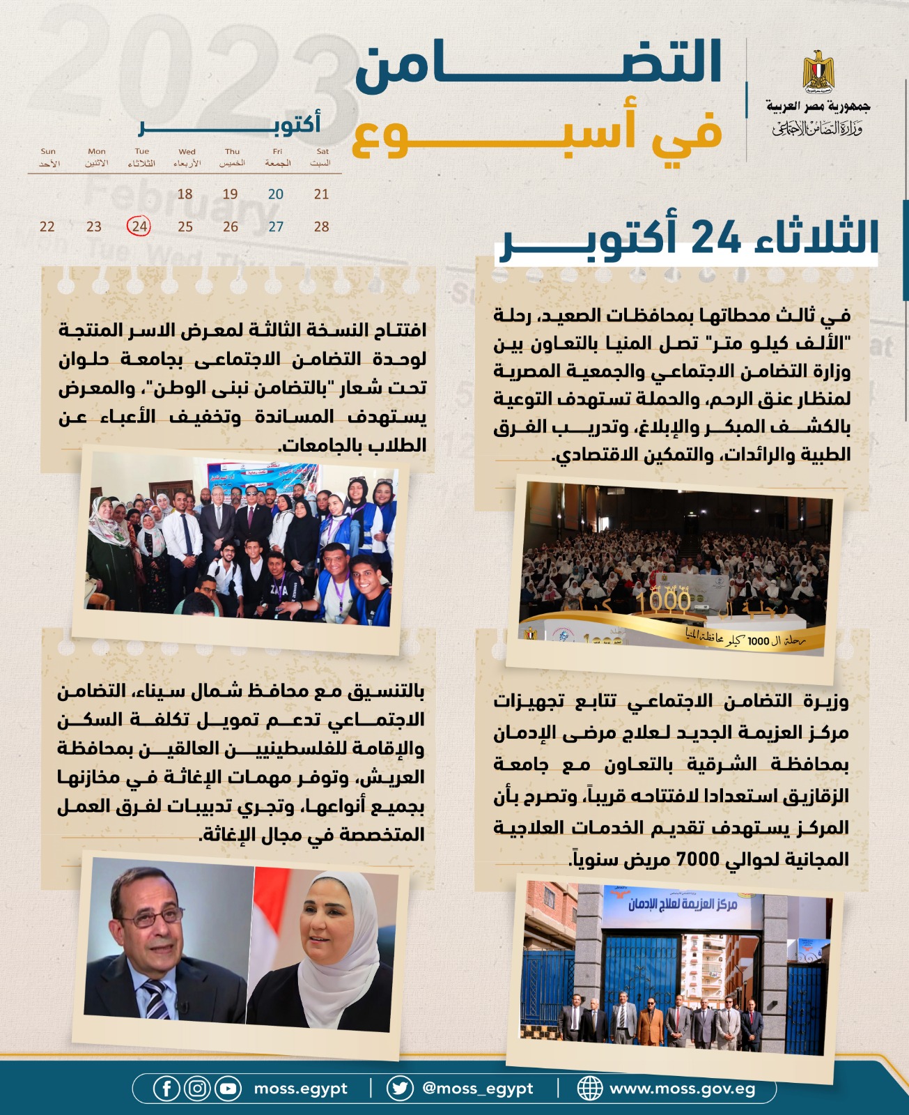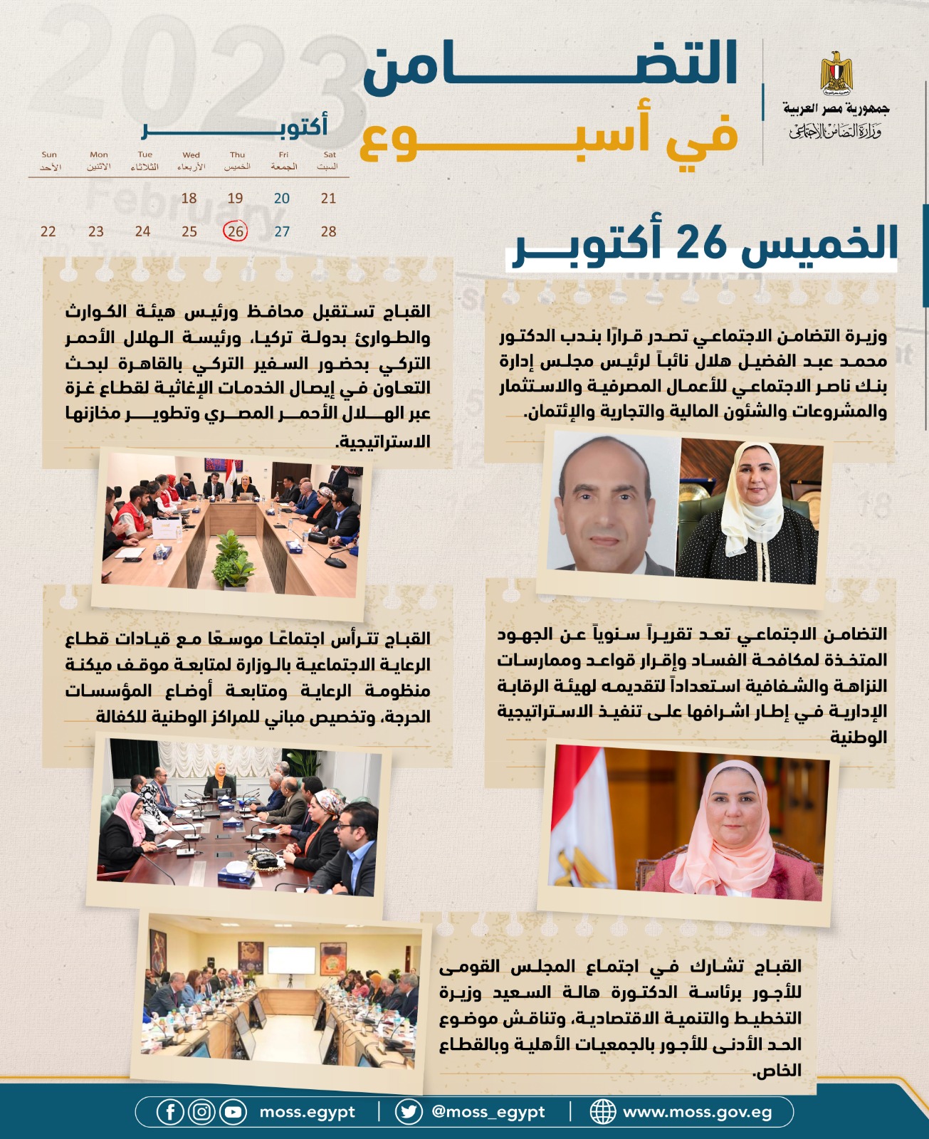 أصدرت وزارة التضامن الاجتماعي تقريرها الأسبوعي بالإنفوجراف والفيديو، حيث تستعرض من خلاله الأنشطة والأحداث، التي قامت بها السيدة نيفين القباج وزيرة التضامن الاجتماعي، وكذلك قطاعات الوزارة المختلفة خلال الفترة من 20 أكتوبر إلى 26 أكتوبر ، ونستعرض أبرزها في التقرير التالي: