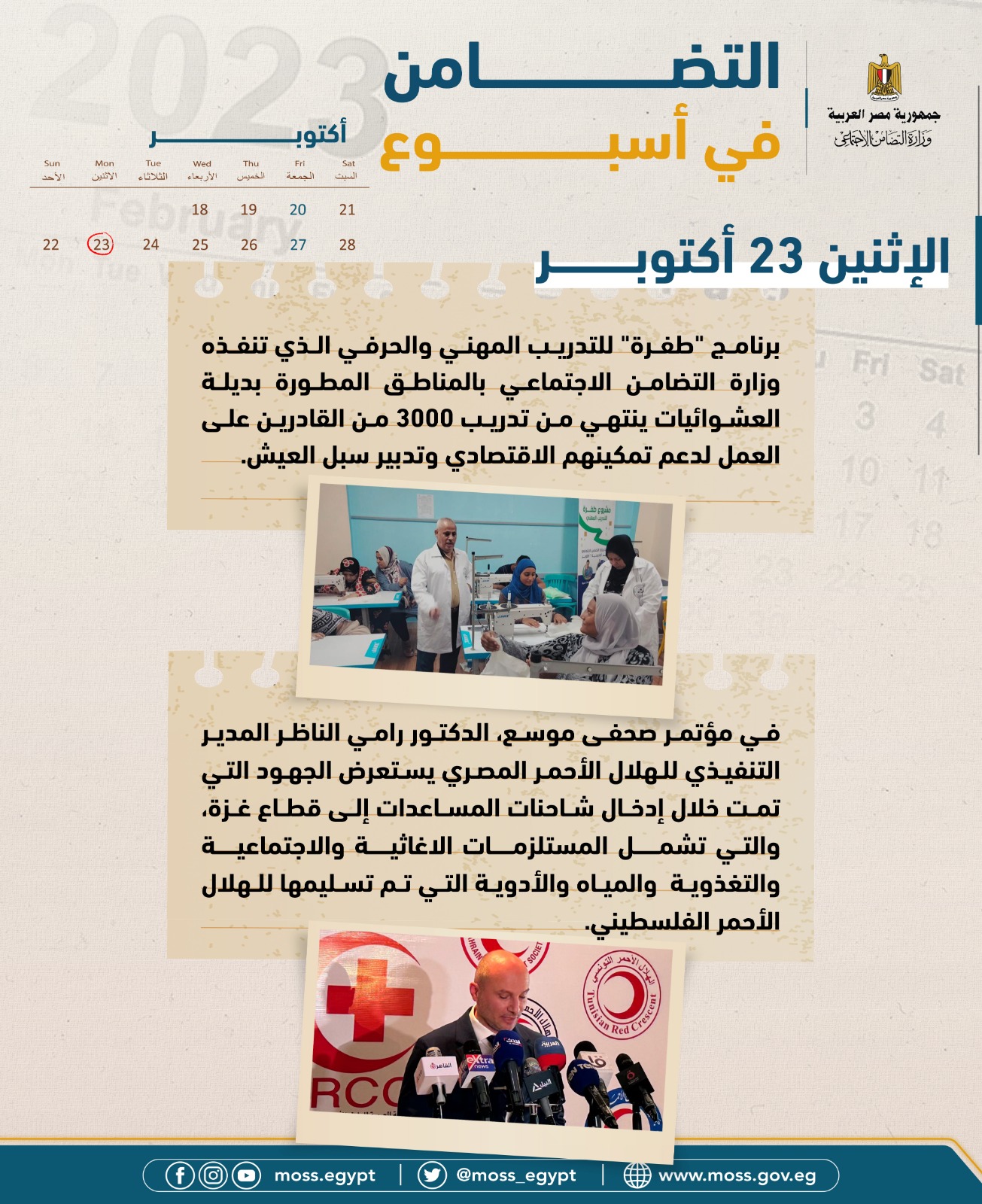 بالتنسيق مع محافظ شمال سيناء، التضامن الاجتماعي تدعم تمويل تكلفة السكن والإقامة للفلسطينيين العالقين بمحافظة العريش، وتوفر مهمات الإغاثة في مخازنها بجميع أنواعها، وتجري تدبيبات لفرق العمل المتخصصة في مجال الإغاثة.