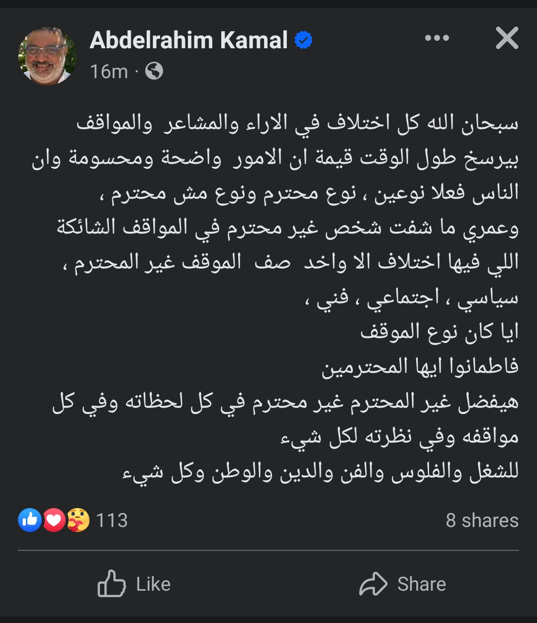 كتب عبد الرحيم كمال منشور على صفحته الرسمية عبر موقع التواصل الاجتماعي “ فيسبوك “ و علق قائلا ” سبحان الله كل اختلاف في الآراء و المشاعر و المواقف بيرسخ طول الوقت قيمة إن الأمور واضحة و محسومة و إن الناس فعلا نوعين، نوع محترم و نوع مش محترم " .
