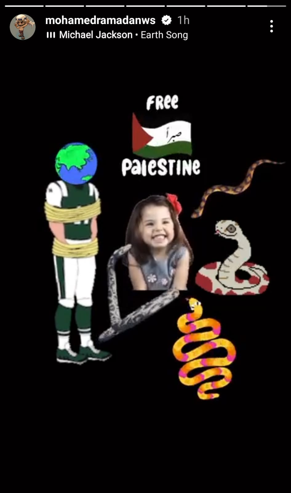 نشر محمد رمضان ستوري على صفحته الرسمية عبر موقع تبادل الصور و الفيديوهات “ إنستجرام ” و علق قائلا “ فلسطين حرة .. صبرا ” .
