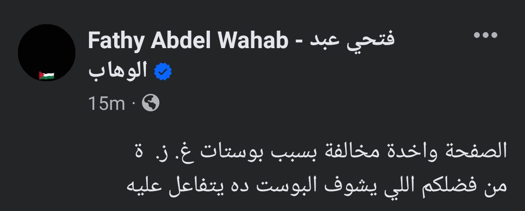 كتب فتحي عبد الوهاب منشور على صفحته الرسمية عبر موقع التواصل الاجتماعي "فيسبوك" وعلق قائلا: "الصفحة واخدة مخالفة بسبب بوستات غزة، من فضلكم اللي يشوف البوست ده يتفاعل عليه".