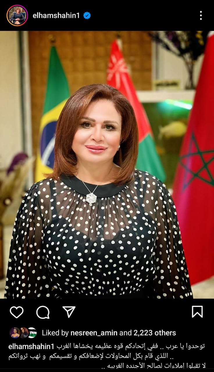 شاركت إلهام شاهين جمهورها بصورة لها تدعو فيها الشعوب العربية بالوحدة والتضامن، وكتبت: "توحدوا يا عرب ففي إتحادكم قوة عظيمة يخشاها الغرب الذي قام بكل المحاولات لإضعافكم وتقسيمكم ونهب ثرواتكم لا تقبلوا إملاءات لصالح الأجندة الغربية كونوا أصحاب قرار مستقل لصالح المنطقة العربية الغرب يريد نشر الفوضى في المنطقة العربية وتقسيمنا وتفكيك جيوشنا العربية.. قام الغرب بكل المحاولات لإضعاف الجيوش في العراق وسوريا وليبيا وأيضا في اليمن والسودان.. هذه الدول تحتاج المليارات لإعادة بنائها وإستعادة قوتها بعد الخراب والدمار الإقتصادي وأيضا الدمار النفسي للشعوب أمريكا ليست دولة بل قارة كبيرة متحدة والإتحاد الأوروبي جمع كل الدول الأوروبية بإختلاف لغاتهم ليكونوا قوة متحدة ولو تم إتحاد العرب سنكون قوة يتعمل لها ألف حساب هذا هو الحلم العربي".