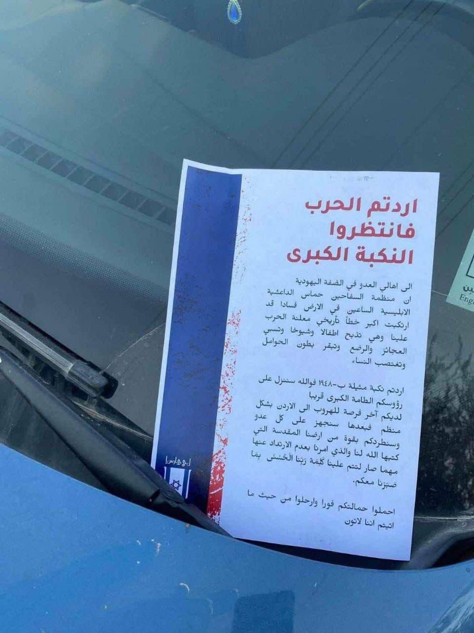 وألقى مستوطنون يهود منشورات على أهالى الضفة الغربية مطالبينهم بالهروب إلى الأردن ، وهددوا بإرتكاب مجازر كبرى فى حالة عدم رحيلهم رداً على ما فعلته حماس.