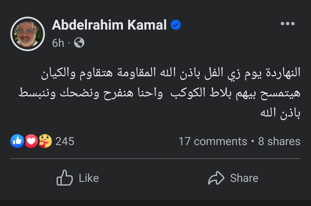 كتب عبد الرحيم كمال منشور على صفحته الرسمية عبر موقع التواصل الاجتماعي "فيسبوك " وعلق قائلا: "النهاردة يوم زي الفل بإذن الله، المقاومة هتقاوم والكيان هيتمسح بيهم بلاط الكوكب، واحنا هنفرح ونضحك وننبسط بإذن الله " .
