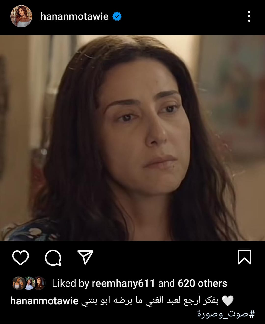 نشرت حنان مطاوع صورة على صفحتها الرسمية عبر موقع تبادل الصور والفيديوهات "إنستجرام "و علقت قائلة " بفكر أرجع لعبد الغني ما برضه أبو بنتي " .