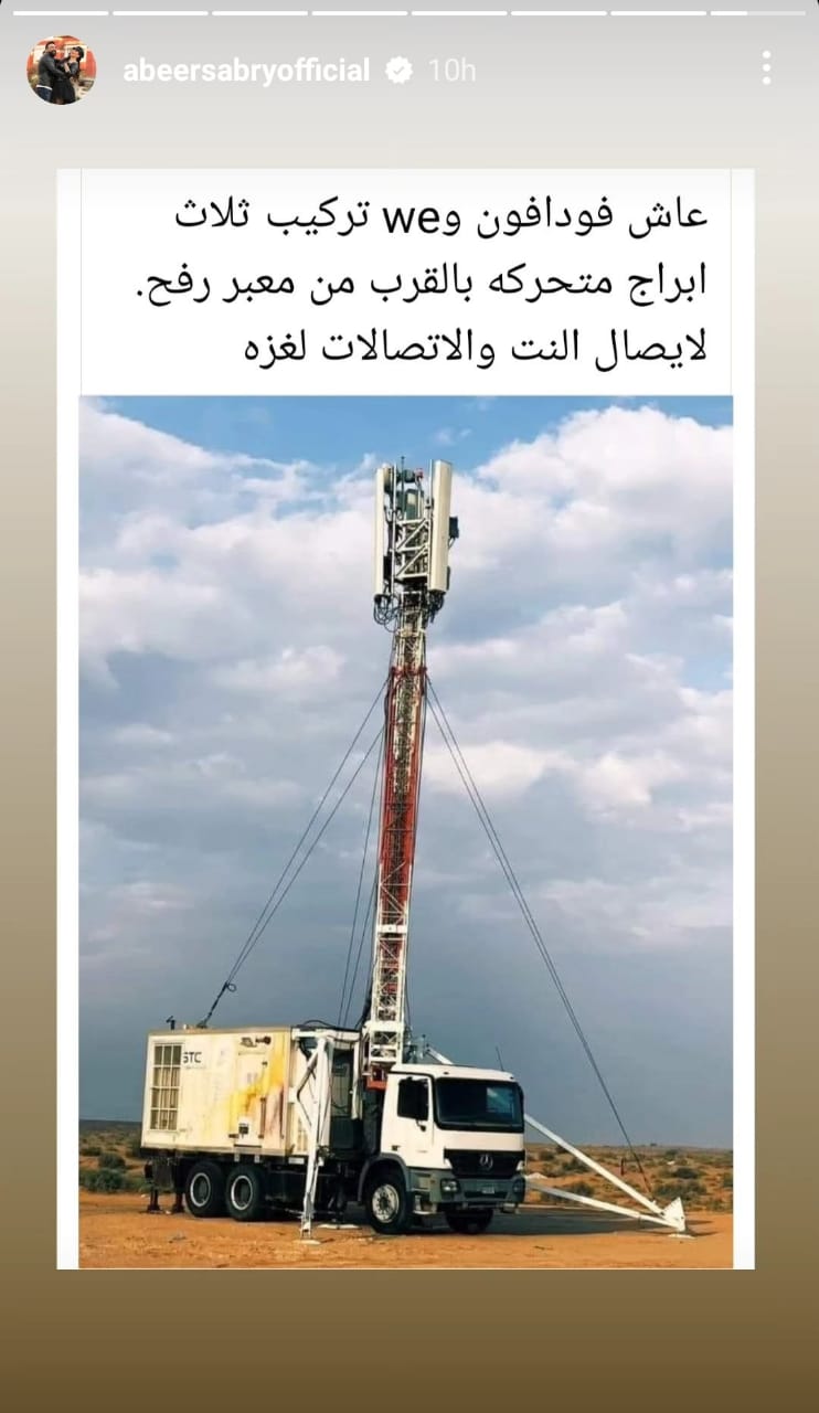 نشرت الفنانة عبير صبري، عبر ستوري حسابها الرسمي على موقع تبادل الصور والفيديوهات “إنستجرام” “عاش .. تركيب أبراج متحركة بالقرب من معبر رفح لإيصال النت والاتصالات لـ غزة”.