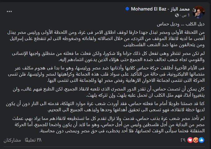 محمد الباز: إطلاق "حماس" لكلابها علي مصر لن ينفع .. ومستمرون في دعم "أهالي غزة"