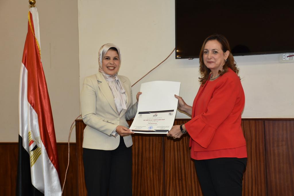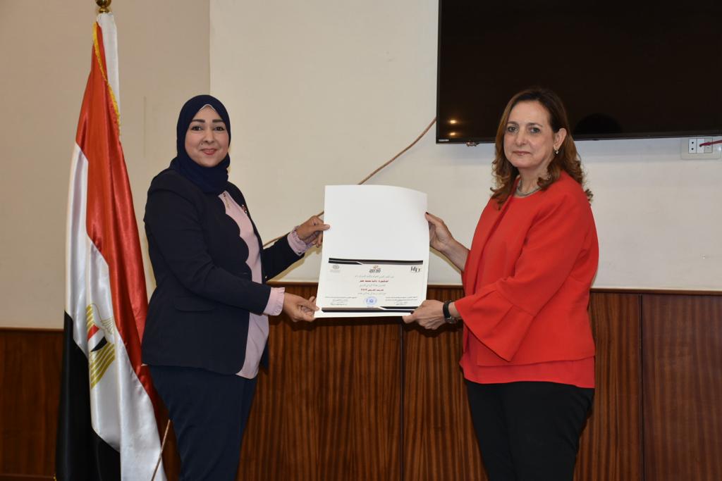 وقامت شريف، بتوزيع شهادات المشاركة في البرنامج التدريبي على 25 متدرب من السادة أعضاء هيئة تدريس وقيادات جامعة كفر الشيخ.
