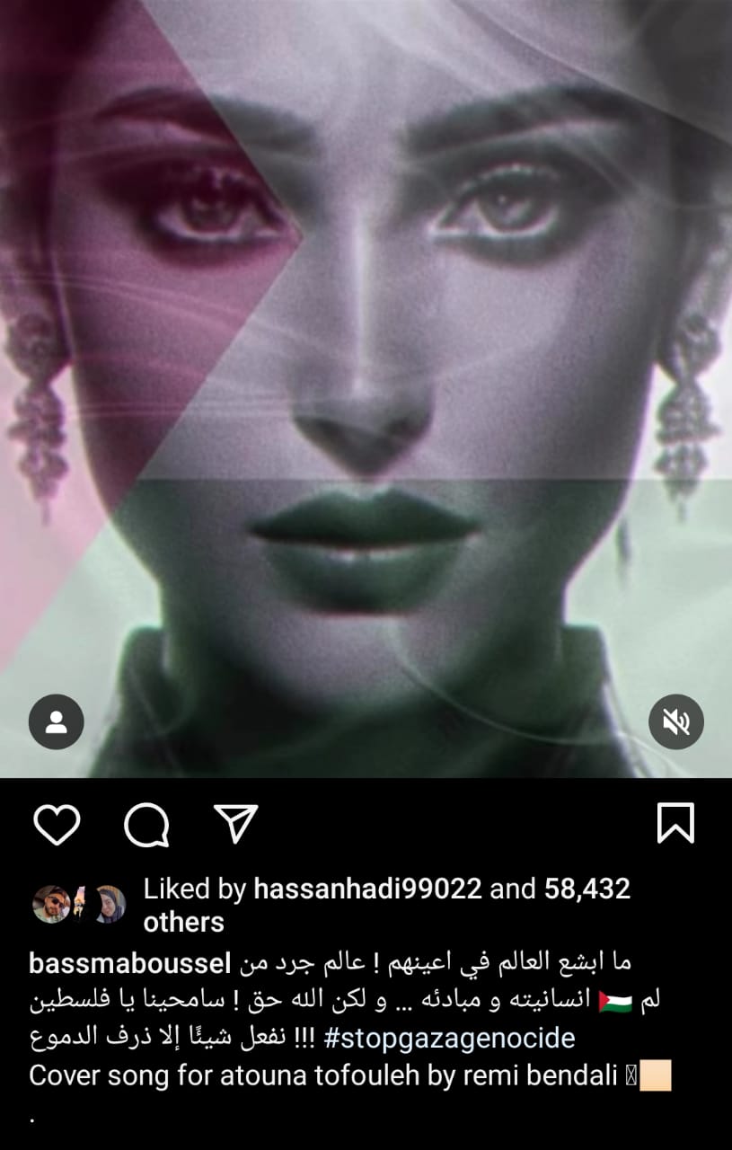 بسمة بوسيل .. نشرت بسمة بوسيل مقطع فيديو لأغنية " أعطونا الطفولة " على صفحتها الرسمية عبر موقع تبادل الصور والفيديوهات " إنستجرام " وعلقت قائلة " ما أبشع العالم في أعينهم، عالم جرد من إنسانيته و مبادئه .. ولكن الله حق، سامحينا يا فلسطين لم نفعل شيئا إلا ذرف الدموع " .