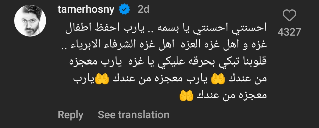 بسمة بوسيل .. فاجئ تامر حسني الجميع وذلك عندما علق على الفيديو الذي نشرته قائلا " أحسنتي أحسنتي يا بسمة .. يارب احفظ أطفال غزة وأهل غزة العزة، أهل غزة الشرفاء الأبرياء .. قلوبنا تبكي بحرقة عليكي يا غزة، يارب معجزة من عندك .. يارب معجزة من عندك .. يارب معجزة من عندك " .