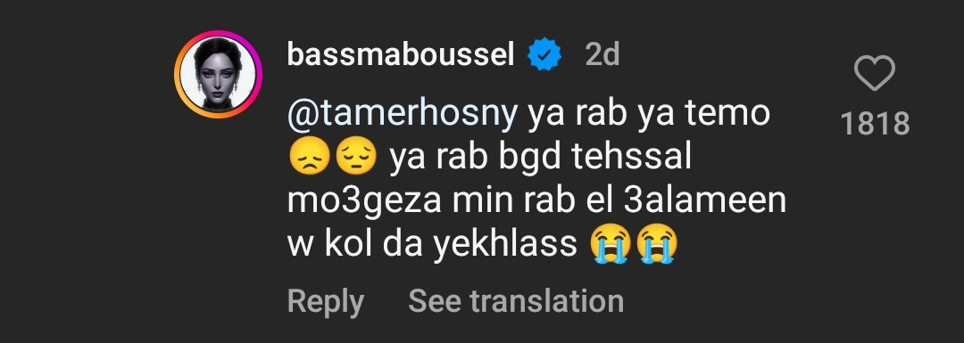 بسمة بوسيل .. لترد بسمة على تعليقه قائلة " يارب يا تيمو، يارب بجد تحصل معجزة من رب العالمين وكل ده يخلص "