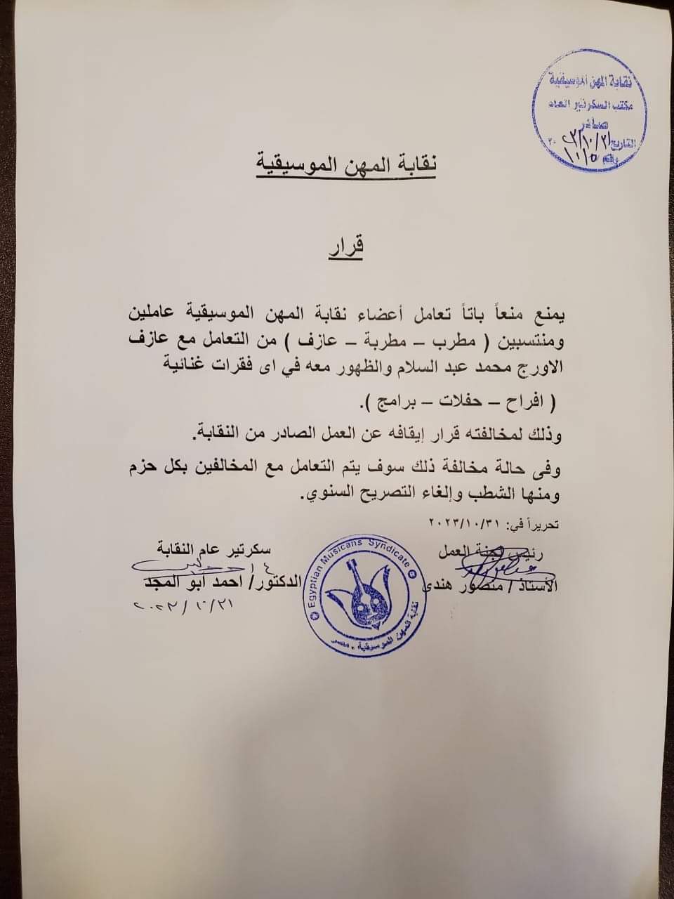لذا، تقرر رفع الإيقاف عن الفنان محمد عبد السلام معوض أحمد خضير (تصريح سنوي - عازف أورج) مؤقتا وذلك لحين استكمال باقي التزاماته المالية في خلال خمسة عشر يوما اعتبارا من تاريخ 17/1/2023 وإلغاء قرار الوقف السابق صدوره من النقابة ويعمم ذلك القرار على جميع المنشأت ومنظمي الحفلات.
