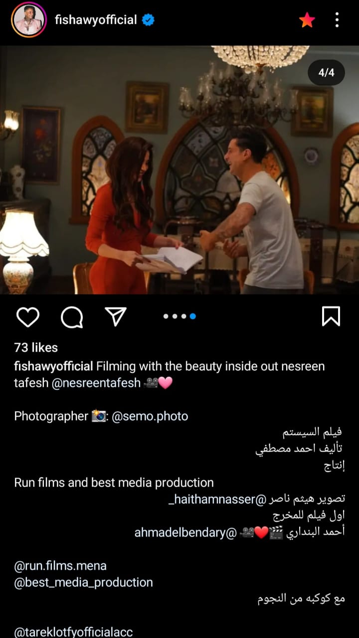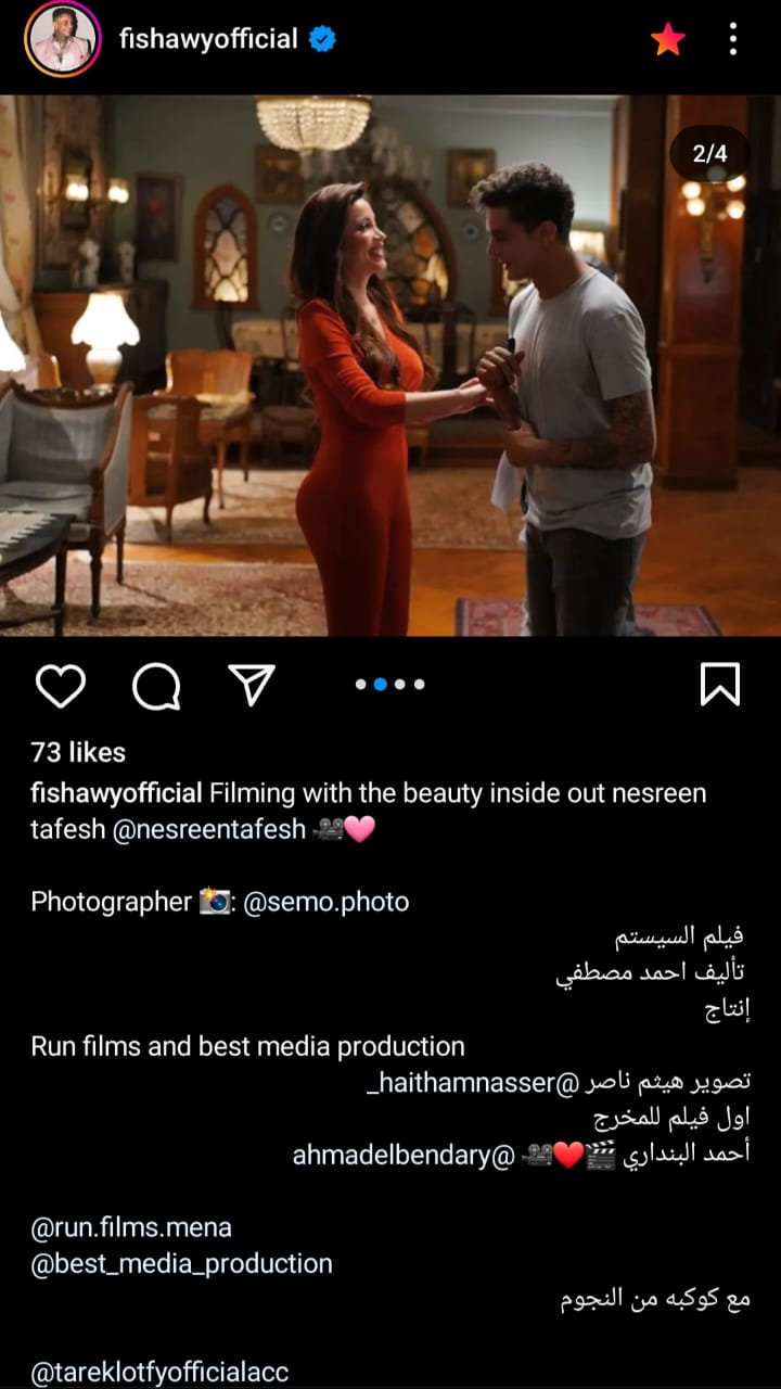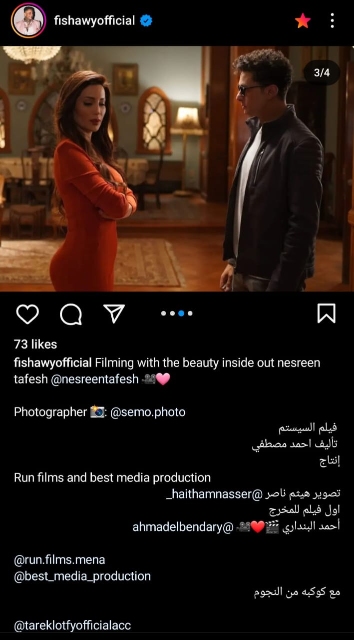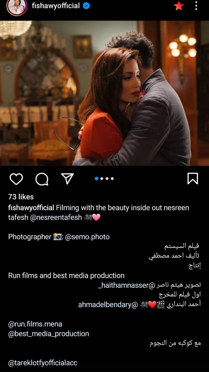 كتب الفيشاوي"تصوير الجميلة نسرين طافش من الداخل للخارج فيلم السيستم تأليف أحمد مصطفى، وإنتاج ران فيلم للإنتاج الفني تصوير هيثم ناصر أول فيلم للمخرج أحمد البنداري مع كوكبة من النجوم طارق لطفي، بسنت شوقي، رانيا منصور، ميس حمدان، نهى عابدين، أحمد فهيم".