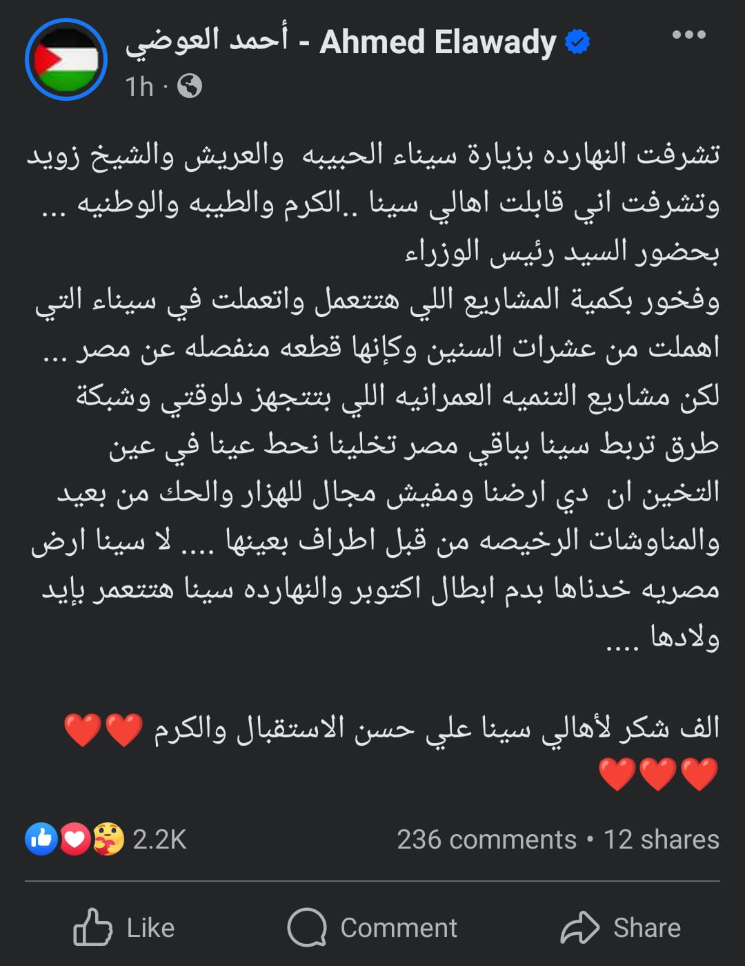 واختتم " ألف شكر لأهالي سينا على حسن الاستقبال والكرم " .
