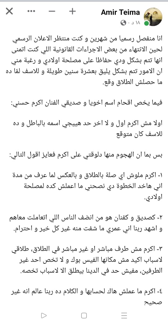 وقال أمير طعيمة: “انا منفصل رسميا من شهرين وكنت منتظر الاعلان الرسمي لحين الانتهاء من بعض الاجراءات القانونية اللي كنت اتمنى إنه ا تتم بشكل ودي حفاظا على مصلحة اولادي”.