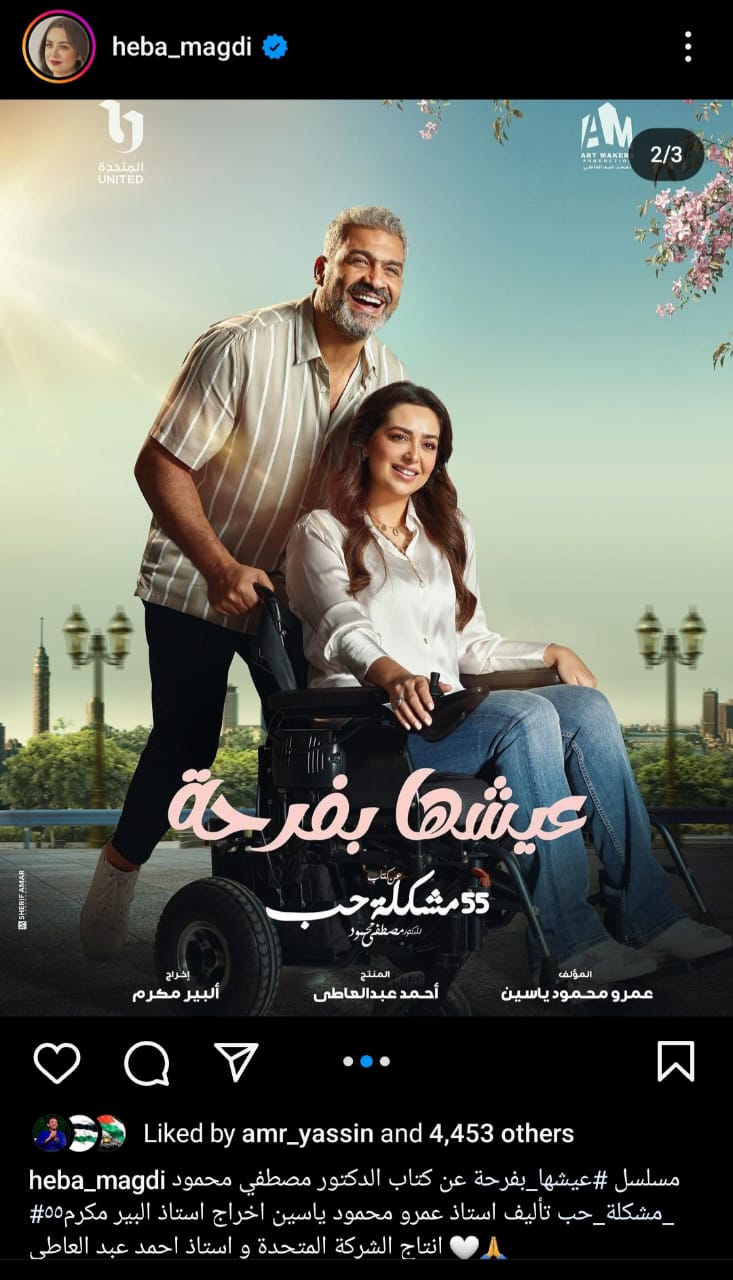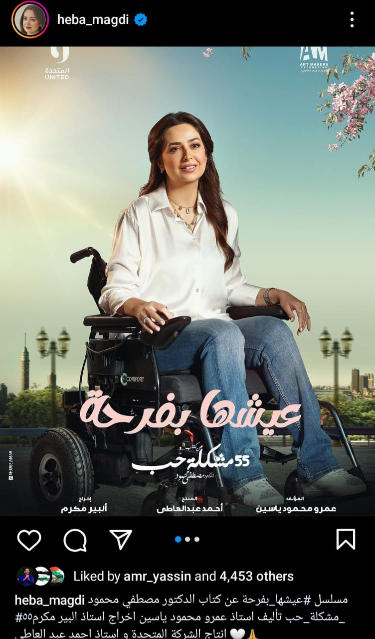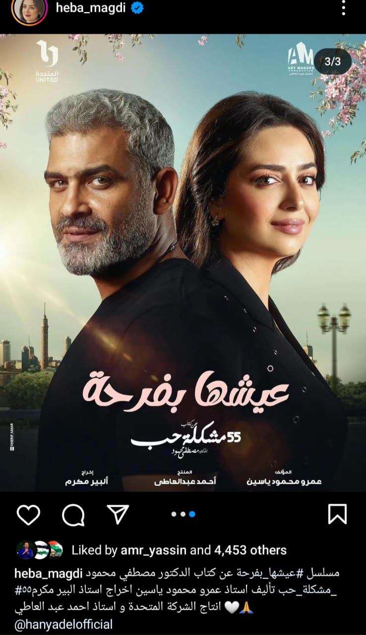 وكتبت هبة"مسلسل عيشها بفرحة عن كتاب الدكتور مصطفى محمود 55 مشكلة حب تأليف أستاذ عمرو محمود ياسين، إخراج أستاذ ألبير مكرم، إنتاج الشركة المتحدة وأستاذ أحمد عبدالعاطي.