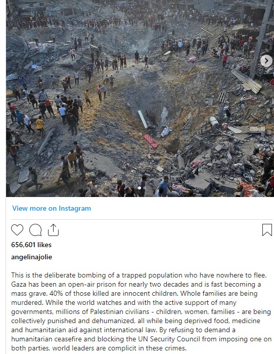 أعادت النجمة العالمية أنجلينا جولي استنكارها لما يعيشه سكان قطاع غزة، وشاركت عبر حسابها في "انستجرام" صورة لمجزرة مخيم جباليا نتيجة الهجوم الإسرائيلي التي خلّفت مئات القتلى من المدنيين بالإضافة إلى دمار هائل.