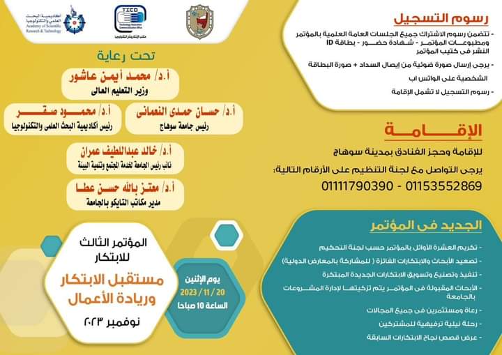 وذلك تحت رعاية الدكتور محمد أيمن عاشور وزير التعليم العالي، والدكتور محمود صقر رئيس أكاديمية البحث العلمي والتكنولوجيا، وذلك في ٢٠ نوفمبر الجاري، بقاعة قناة السويس بالحرم الجامعي الجديد.